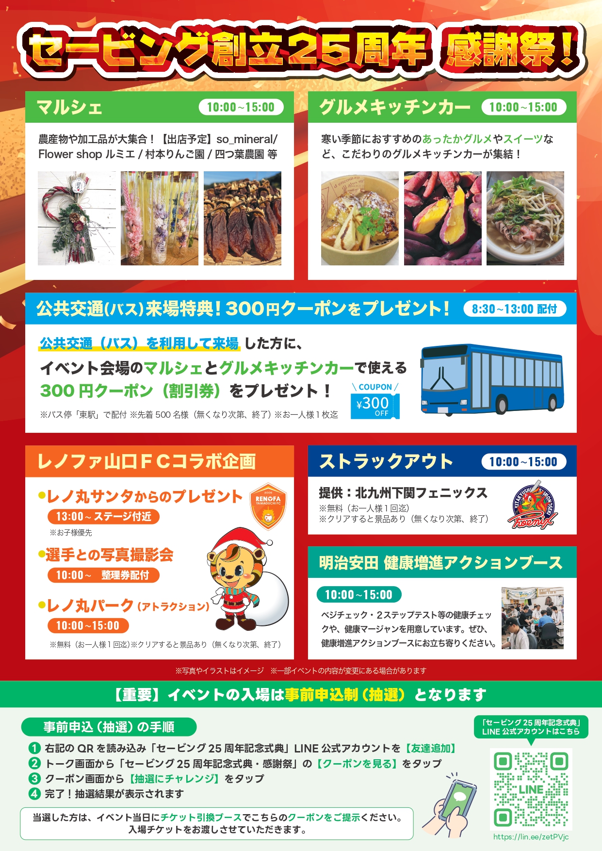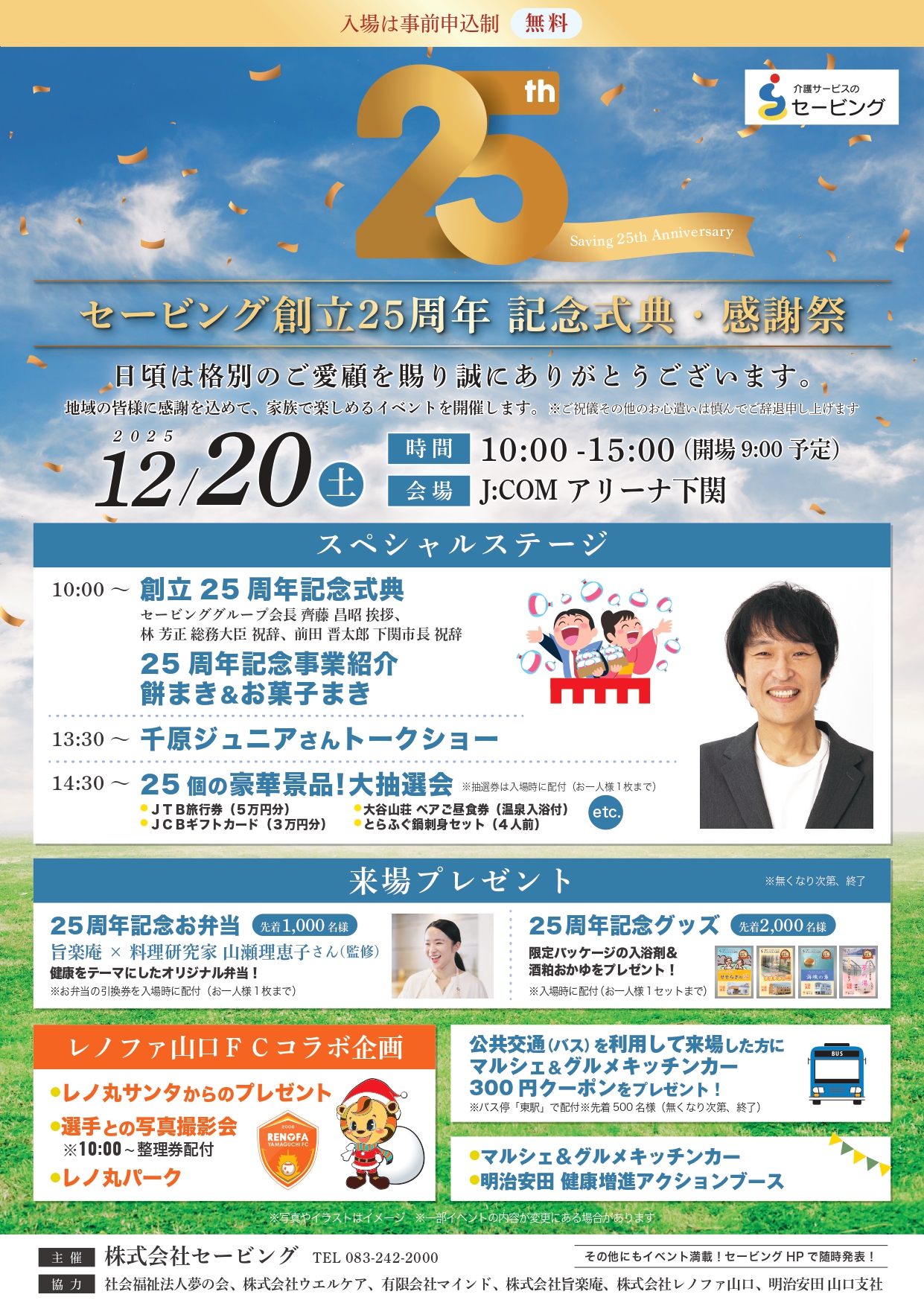 12/20(土)にJ:COMアリーナにてセービング創立25周年式典を開催します。ご利用様、ご家族様、日ごろよりお世話になっている法人様をご招待し、千原ジュニア氏のトークショーを中心に様々な催し物を準備しています。